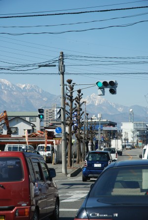 甲府盆地から眺める2月の甲斐駒ヶ岳(信号の真下)